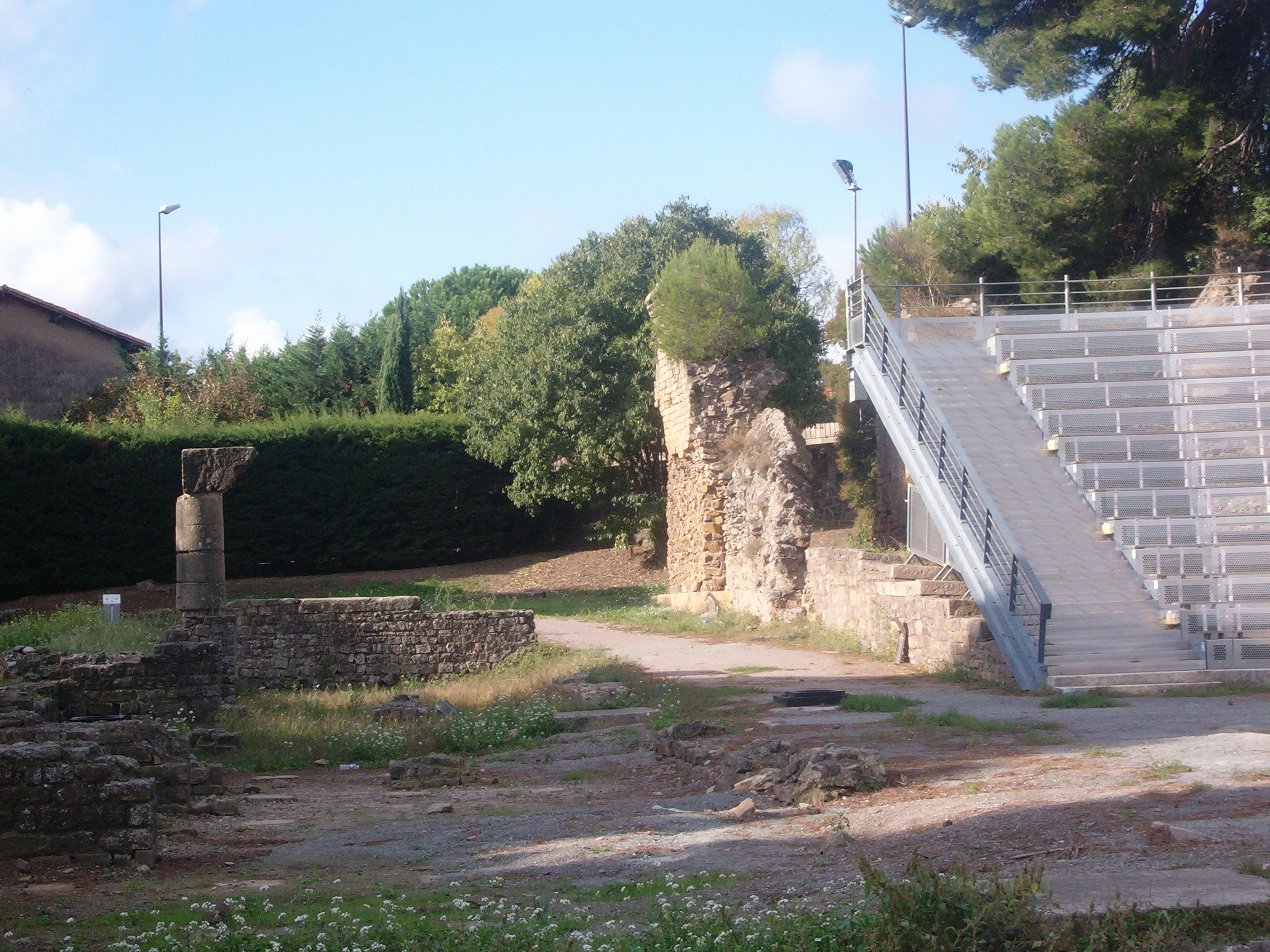The easy-on-the-eye perforated steel seating tiers which have been put up inside the Roman theatre are arguably an ideal way to keep this ancient space in use for putting on shows and performances, while at the same time respecting the Roman construction. The modern seating is completely detached from the original stonework which dates from the 1st century AD: wandering around between the new seating and the old it is still possible to capture an idea of how the theatre would have been 2,000 years ago. The column on the left of the second photo is where the original stage area would have begun. The theatre is clearly visible in the photo of the model of Fréjus.
