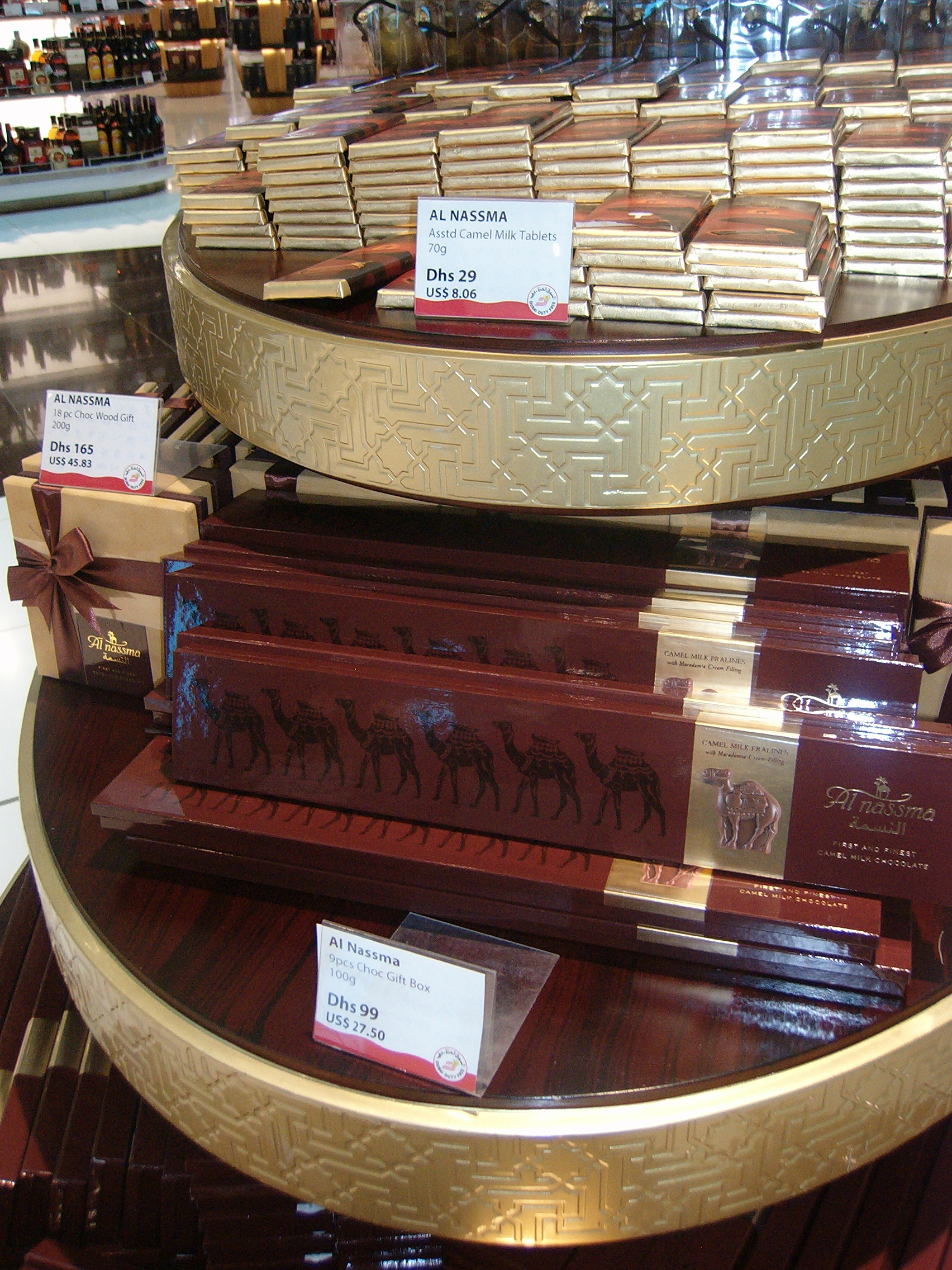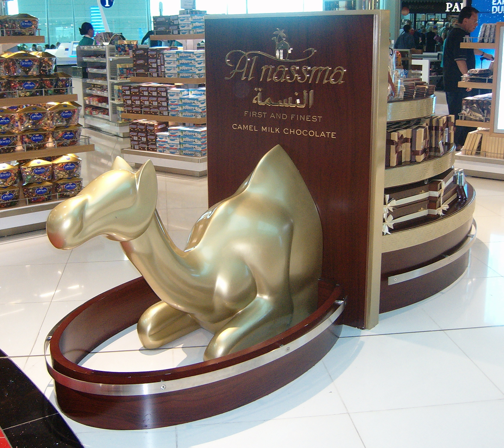 I did a double take as I strolled past this fabulous golden camel in Dubai airport’s departure lounge. Being a dark chocolate lover I bought the 70 gram, 70% cocoa bar, which contains 2% camel milk powder.